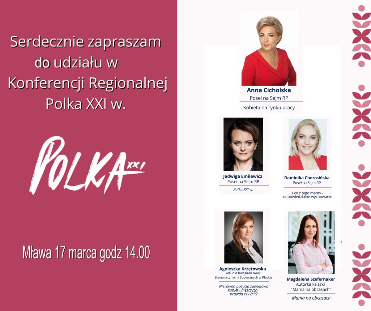 W konferencji z inicjatywy p. Poseł Anny Cicholskiej wezmą udział m.in.: Poseł Jadwiga Emilewicz, Poseł Dominika Chorosińska, dr Agnieszka Krzętowska, autorka książki '' Mama na obcasach '' Magdalena Szefernaker.