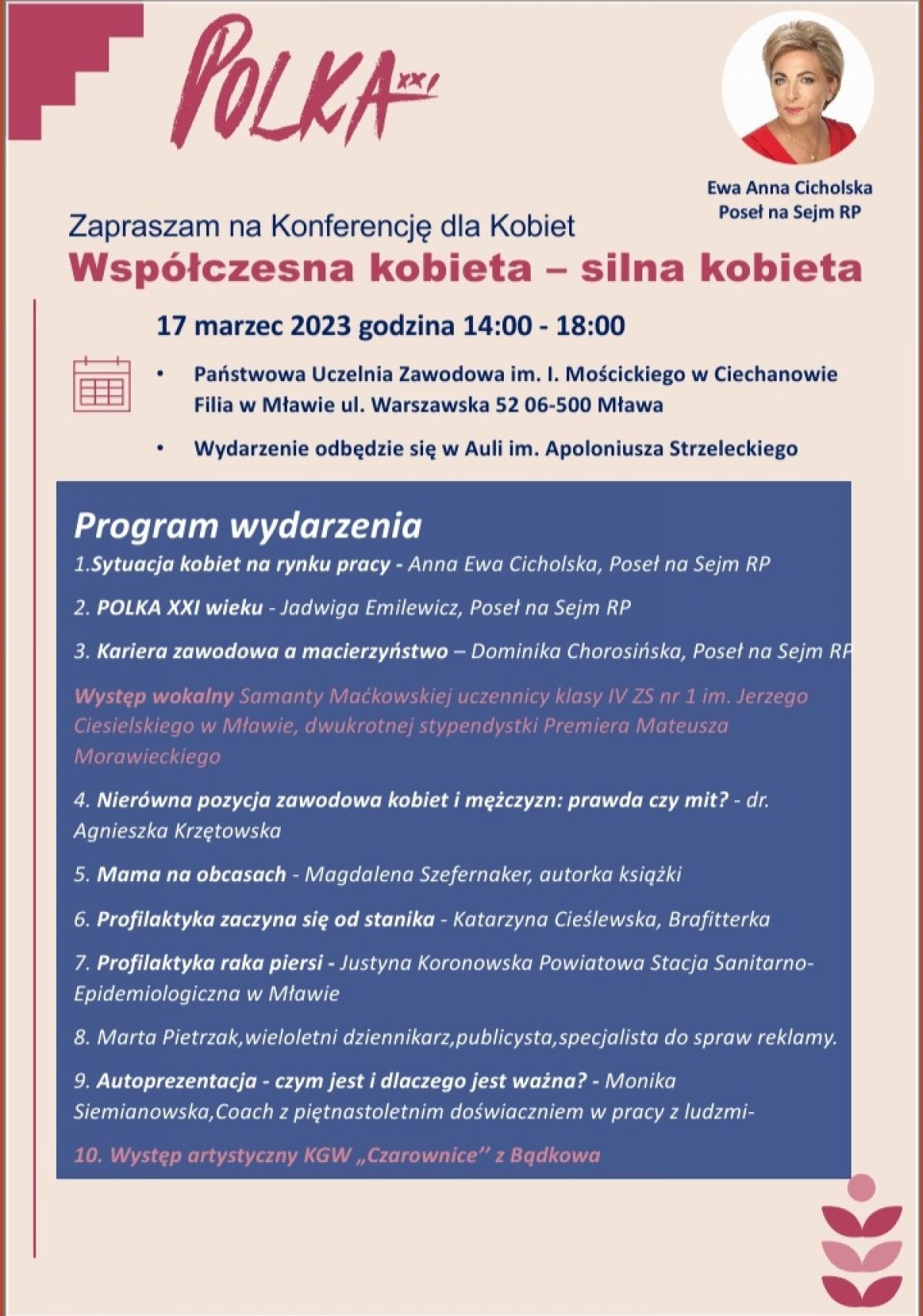 Konferencja '' Współczesna Kobieta – Silna Kobieta'' odbędzie się w dn. 17.03.2023. w godz. 14.00 – 18.00. w Państwowej Uczelni Zawodowej, Filia w Mławie ul. Warszawska 52.