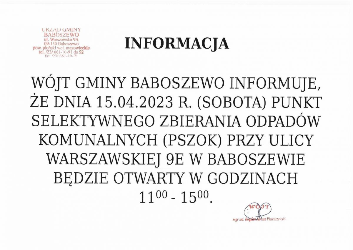Wójt Gminy Baboszewo informuje, że dnia 15.04.2023 r. (Sobota) punkt selektywnego zbierania odpadów komunalnych (PSZOK) przy ulicy Warszawskiej 9E w Baboszewie będzie otwarty w godzinach 11 - 15.